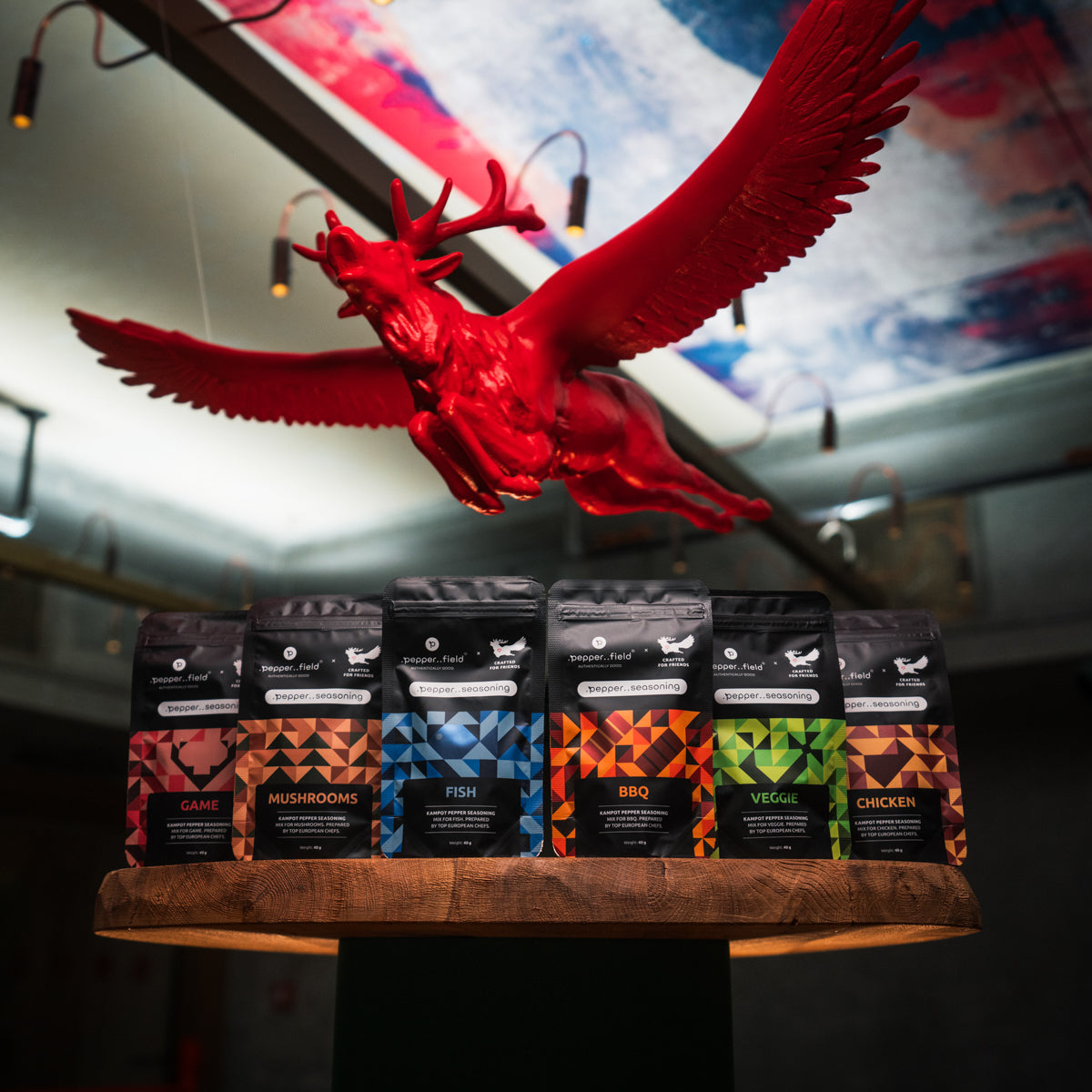 Červený Kampotský pepř 38,5 %, bílý Kampotský pepř 38,5 %, sůl 8 %, jalovec 7,5 %, lyofilizované brusinky 4,5 %, muškátový květ 2 %.