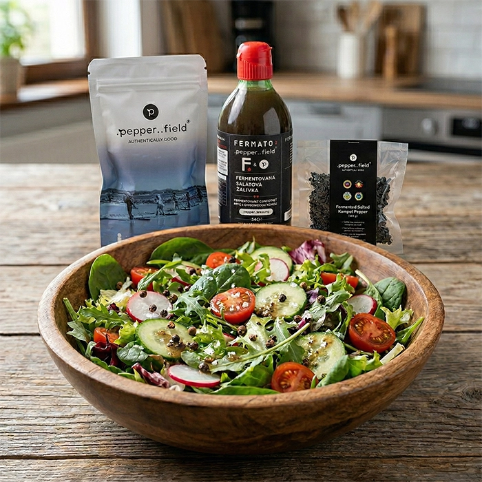 Fermentace potravin zlepšuje jejich stravitelnost a dodává jim typickou návykovou chuť umami (známou jako tzv. přírodní glutamát). Chuť umami je často to, co dodává jídlu největší šmrnc. Proto kombinace fermentované omáčky s naším fermentovaným pepřem byla jasná volba.