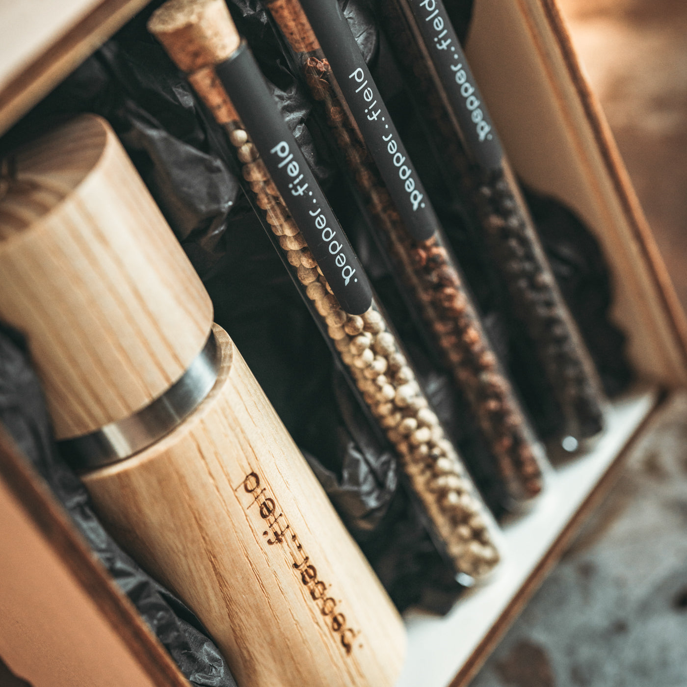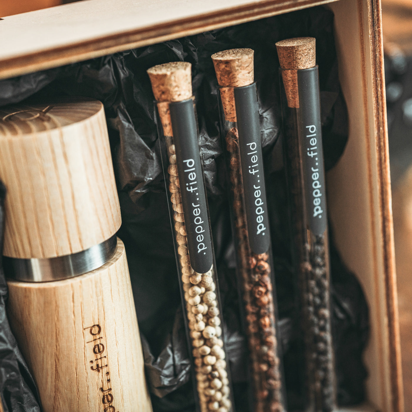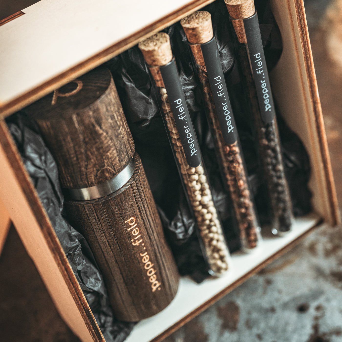Pepper is stored in glass test tubes made of gorgeous Czech glass, and the entire set fits into a wooden box, which can be engraved according to your wishes. We did not choose these packages by chance. Not only do they look beautiful, but they are also made in the Czech Republic and are all from sustainable material that can be easily recycled or upcycled.
